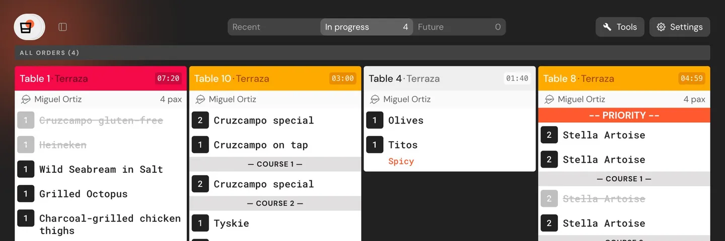 Quello che entra dal POS, Waiter App, QR o delivery arriva al KDS allo stesso modo. Un unico schermo, un unico flusso. Zero tablet sparsi in cucina.